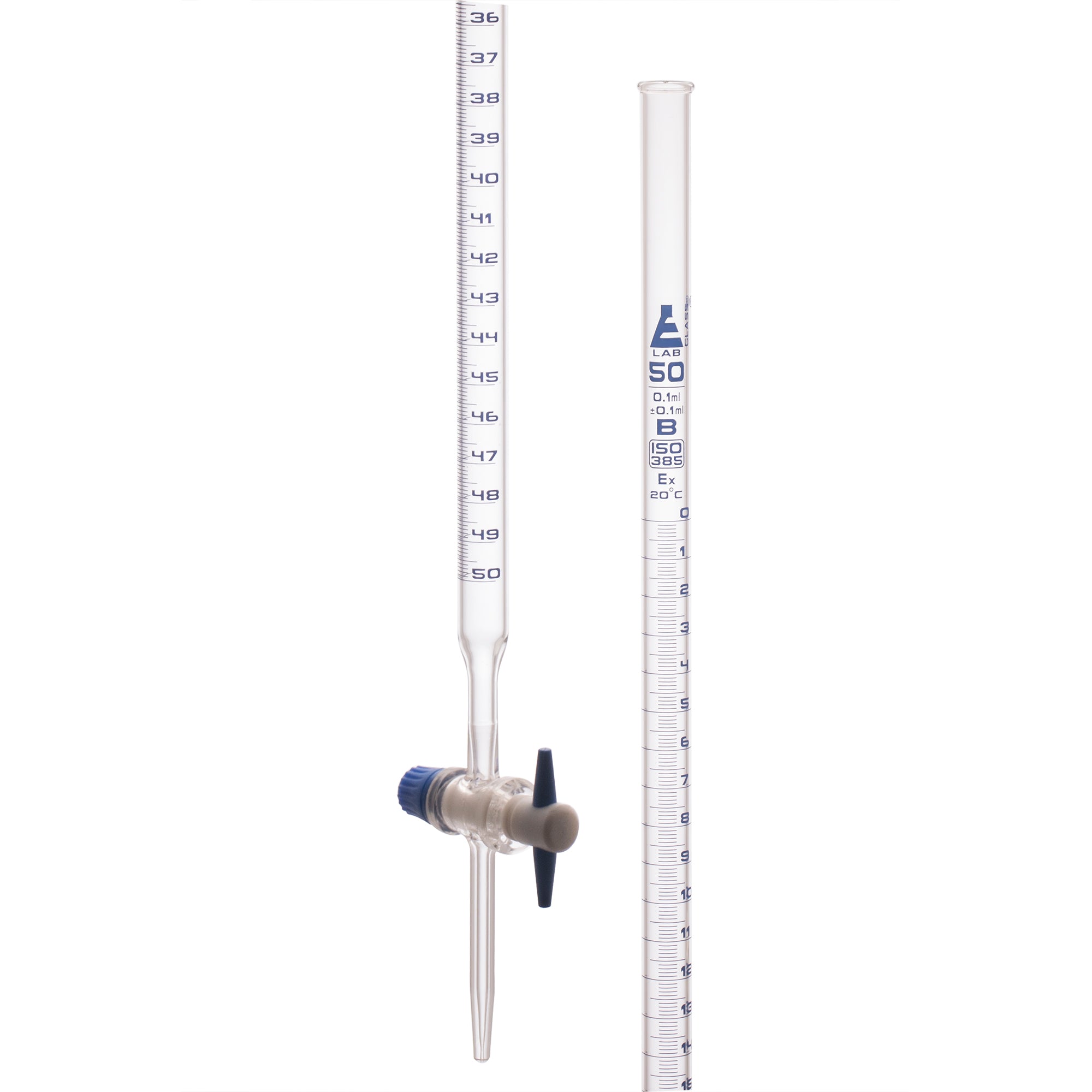 CH0240G Bureta de 50ml de vidrio borosilicato con llave de PTFE clase B, graduación azul, cumple la normas DIN ISO 385 y ASTM E438 Eisco