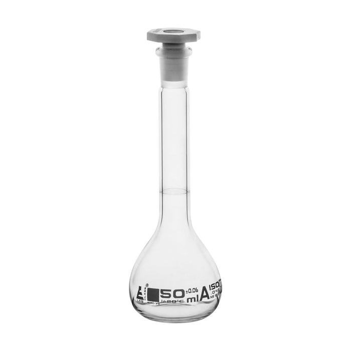 CH0446D-WT Matraz Volumétrico (aforado) 50ml de vidrio borosilicato 3.3 de alta calidad y durabilidad, clase A, cumple la norma DIN ISO 1042, tolerancia de 0.060ml, con tapón de polipropileno 12/21 resistente a químicos, graduación blanca y aforo en color blanco Eisco